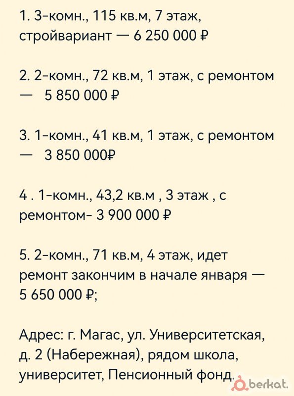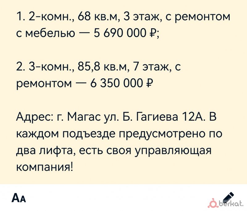Представляем вашему вниманию новый строящийся многоквартирный дом по ул. Градусова в г. Карабулак. Дом представляет собой железобетонный усиленный каркас, фасад дома из кирпича. Сдача планируется к концу 2027 г ин шаа Аллах1. Закрытый благоустроенный двор, просторные лифты ( грузовой и пассажирский) и небольшое количество квартир сделают Ваше проживание максимально комфортным. В доме предусмотрены 1 комнатные квартиры площадью 37 и 45 кв.м. и 2х комнатные квартиры площадью 65 кв.м. Цена 1 квадратного метра составляет 55 тыс в рассрочку до конца 2027 года. При полной оплате предусмотрены скидки. Также на первом этаже расположены нежилые помещения для удобства жителей и комфортного ведения