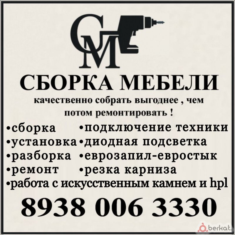 Профессиональная сборка и установка кухонной и спальной мебели быстро качественно и не дорого а так же вырезка мойки и варочной панели регулировка дверей Замена столешницы все вопросы по телефону 89287920272