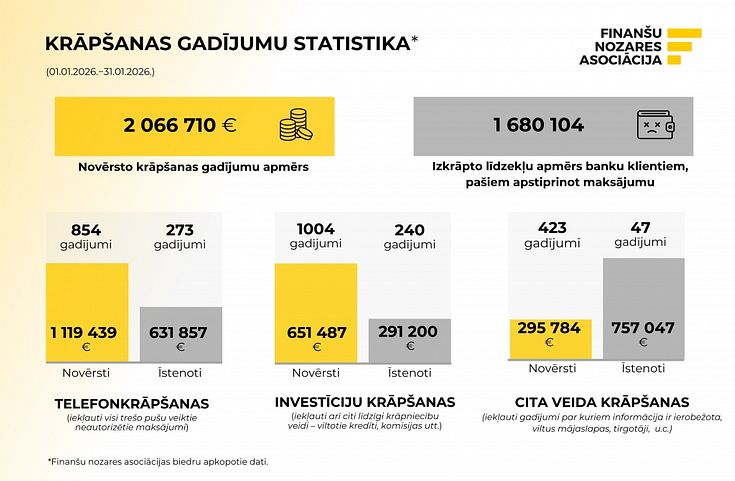 Šī gada janvārī finanšu iestādēm Latvijā izdevies novērst četras reizes vairāk krāpšanas...