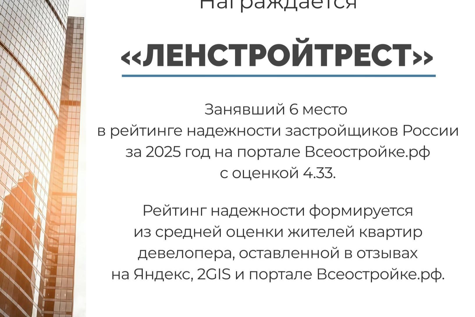 «ЛенÑ?тройтреÑ?т» вошел в топ 10 вÑ?ероÑ?Ñ?ийÑ?кого рейтинга надежноÑ?ти заÑ?тройщиков за 2025 год