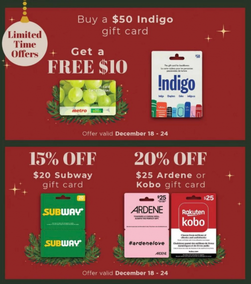 Metro Ontario has a few different gift card offer that start on Thursday, so if you need to pick some up as gifts, here are some of the offers available. From December the 18th to the 24th, get a free $10 Metro gift card with the purchase of a $50 Indigo gift card. You can also save 15% when you purchase $20 Subway cards, or 25% when you purchase $25 Ardene or Kobo gift cards. Here are some of the other deals in the upcoming Metro flyer: