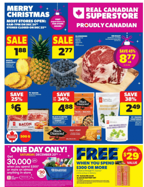 This Saturday, December the 20th only, get 30,000 PC Optimum points when you spend $300 or more in-store only at Real Canadian Superstore. This is an app exclusive offer, and it should apply automatically to your purchase when the required amount is spent. You are able to use coupons to bring down your total spend, and you can also redeem points in your transaction, and you will still earn the 30,000 points. Here are some of the deals in the Superstore flyer that starts tomorrow: