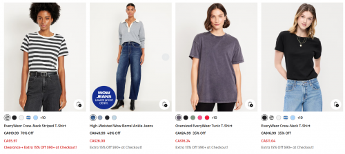 Spend $90 or more at Old Navy Canada and get an extra 15% off your purchase for a limited time. This offer is valid through the end of today, and will also apply to clearance styles starting at just $3.99. The offer will be automatically applied in your cart, and no promotion code is necessary. Members will receive free shipping on orders of $50 or more, and here are some of the womenâs styles that will be an extra 15% off with your purchase of $90: