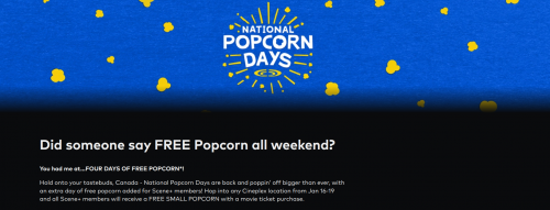 If you are planning to see a movie from January the 16th to the 19th, the National Popcorn Days offer is also back this year. An extra day has been added for 2026, and Scene+ members have four days to enjoy a free small popcorn with the purchase of a movie ticket this weekend.