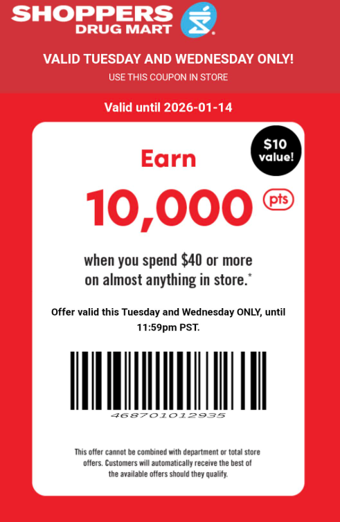Tuesday, January the 13th, and Wednesday, January the 14th, get 10,000 PC Optimum points when you spend $40 or more at Shoppers Drug Mart Canada with this text offer. To get the offer, scan the bar code at the cash in addition to your PC Optimum card. The points should be added to your receipt, however, keep a screen shot of any offer that you use in case you have to contact customer service to get your points added. Here are some of the deals this week at Shoppers Drug Mart:
