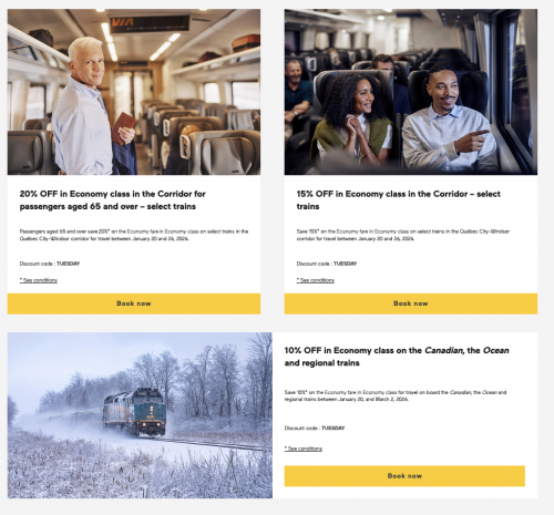 VIA Rail Canada has a great Discount Tuesday Sale, available now, where you can have great offers on economy & business classes.