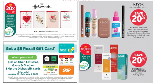 Rexall Canada has a gift card offer this week, and until February the 5th you will get a $5 Rexall gift card when you spend $50 on Uber, Letās Eat, Game & Grub, or Skip the Dishes gift cards. There is a limit of one gift card per customer, per day. If you need to pick up Valentineās Day cards, there is also an offer on Hallmark cards. Spend $12 or more before taxes on select Hallmark Valentineās cards and get 20x the Be Well points on your purchase. If youāll be paying Rexall a visit this week, here are some of the other deals that you will find in-store: