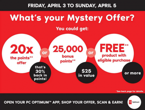 Check your PC Optimum account for a Mystery Offer valid at Shoppers Drug Mart Canada this Friday, April the 3rd, to Sunday April the 5th. You will have one of three offers in your account and it will either be a 20x the points offer, an offer for 25,000 bonus points, or an offer for a free product with an eligible purchase. My Mystery Offer was for the free item, and it is for any cookies or crackers free when you spend $35 or more. There is also a two-day sale this weekend, and here are some of the deals for Saturday and Sunday: