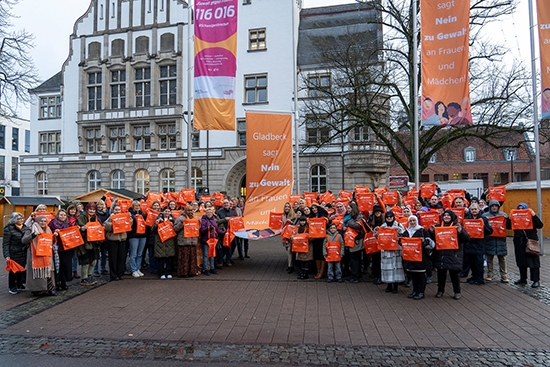 „Gladbeck sagt Nein zu Gewalt an Frauen und Mädchen“ – unter diesem Motto haben sich am Internationalen Tag zur Beseitigung von Gewalt gegen Frauen, Dienstag, 25. November, zahlreiche Gladbecker:innen vor dem Rathaus versammelt und ein sichtbares Zeichen gegen häusliche Gewalt gesetzt.