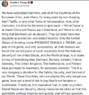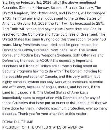 ▪️Президент США объявил о введении 10-процентных пошлин на товары из европейских стран, направивших своих военных в Гренландию. В список вошли Дания, Норвегия, Швеция, Франция, Германия, Великобритания, Нидерланды и Финлянд...