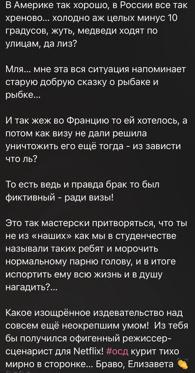 Женщина в своём телеграм-канале написала о том, что Лиза чуть не довела Сашу до суицида, а его бабушку — до инфаркта.