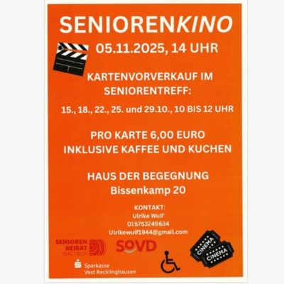 Das Seniorenkino lädt am Mittwoch, 5. November 2025 zu einem gemütlichen Nachmittag voller Filmgenuss und Gemeinschaft ein. Das Seniorenkino findet statt im großen Saal St. Peter im Haus der Begegnung (HdB), Bissenkamp 20. Dort erwartet die Gäste nicht nur ein wunderbarer Kinofilm, sondern auch duftender Kaffee und leckerer Kuchen in geselliger Runde. Die Karten für das Seniorenkino kosten 6 Euro. Sie können am Mittwoch, 29. Oktober 2025 von 10 bis 12 Uhr im Seniorentreff am Markt (neben dem dm-Drogeriemarkt) gekauft werden. Diesmal entführt der Film die Zuschauer:innen auf eine sonnendurchflutete Mittelmeerinsel, wo Liebe, Freundschaft und Lebensfreude im Mittelpunkt stehen. Zwischen türkisblauem Meer, mediterranen Klängen und einer mitreißenden Geschichte entsteht eine...