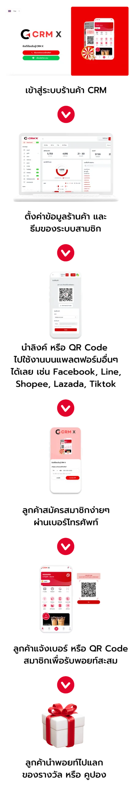 สะสมแต้มง่ายๆ เพียงแค่สแกน QR Code ผ่าน CRM X เพื่อแลกของรางวัล ฟีเจอร์ใช้งานง่าย สะดวก เหมาะสำหรับร้านค้าและธุรกิจทุกรูปแบบ