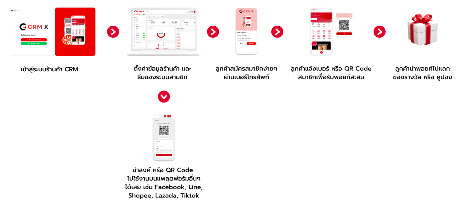 ระบบสะสมแต้ม CRM X แบ่งออกเป็น 2 ฝั่งคือ ฝั่งร้านค้า กับฝั่งลูกค้าใช้งานบนเว็บไซต์ (ไม่ต้องดาวน์โหลดแอปพลิเคชัน) เมื่อสร้างร้านค้าในระบบสำเร็จ ร้านค้าจะได้รับ link และ QR Code ของร้านตัวเอง แล้วนำ link หรือ QR Code ไปให้ลูกค้าเข้า หรือสแกนเพื่อสมัครสมาชิก เมื่อลูกค้ามาครั้งถัดไปเพียงบอกเบอร์โทรศัพท์กับพนักงานก็จะเพิ่มแต้มสำเร็จ